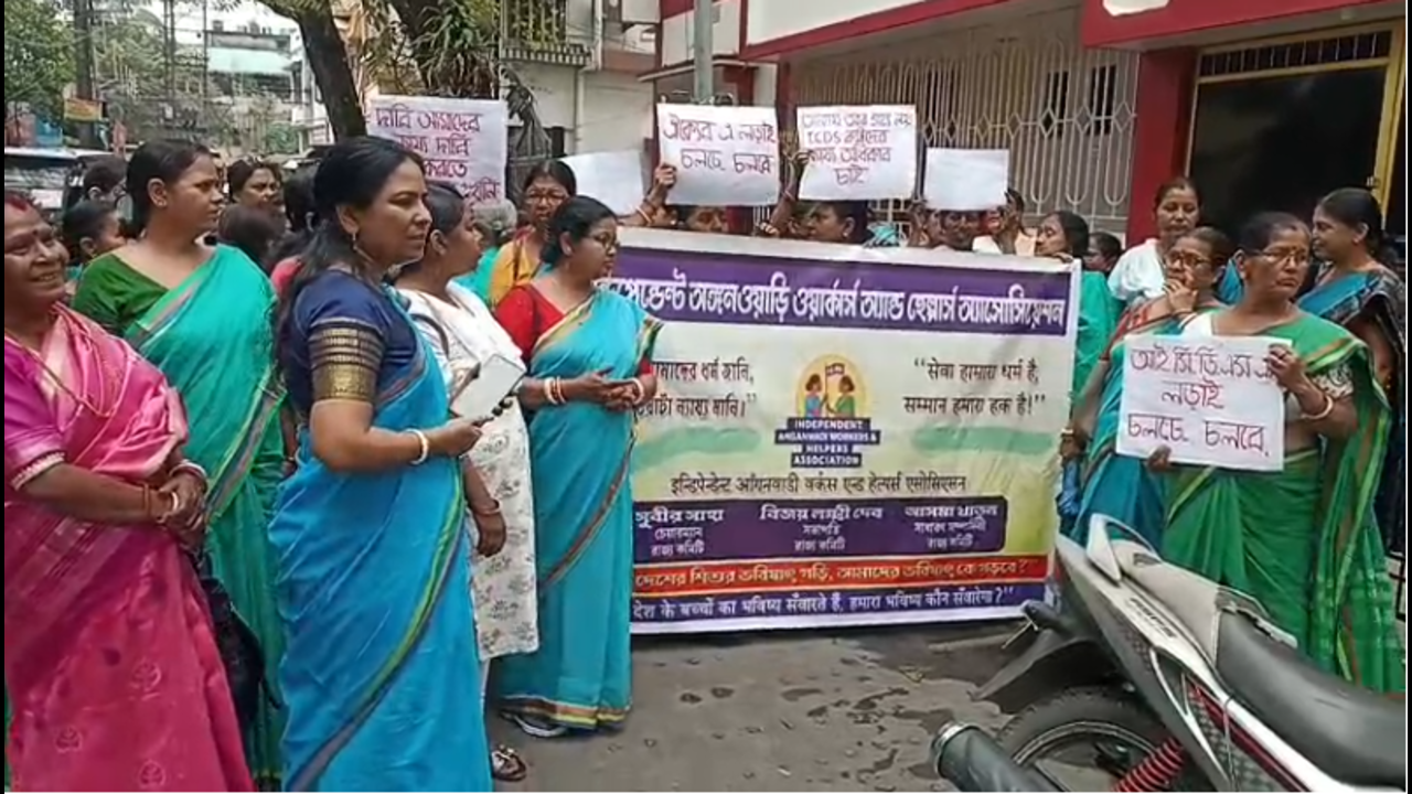 বকেয়া ডিএ-সহ একাধিক দাবিতে ধর্মঘট, শিলিগুড়িতে বিক্ষোভে অঙ্গনওয়ারী কর্মীরা